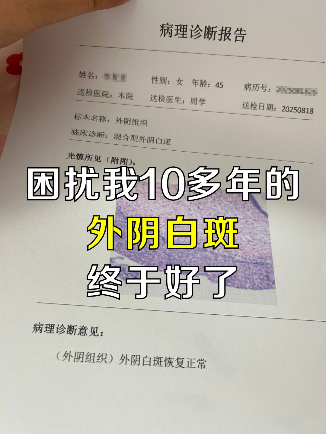 10多年前,我查出了外阴白斑,万幸找对了方法,现在已经治好了!医生说我当时的症状不算特别严重,建议我尽快接受治疗。于是在这期间我擦过激素药膏、照灯、烤电、海扶刀手术,精力和钱都付出了不少....万幸我最后找对了方法,遇到良医良方治好了!